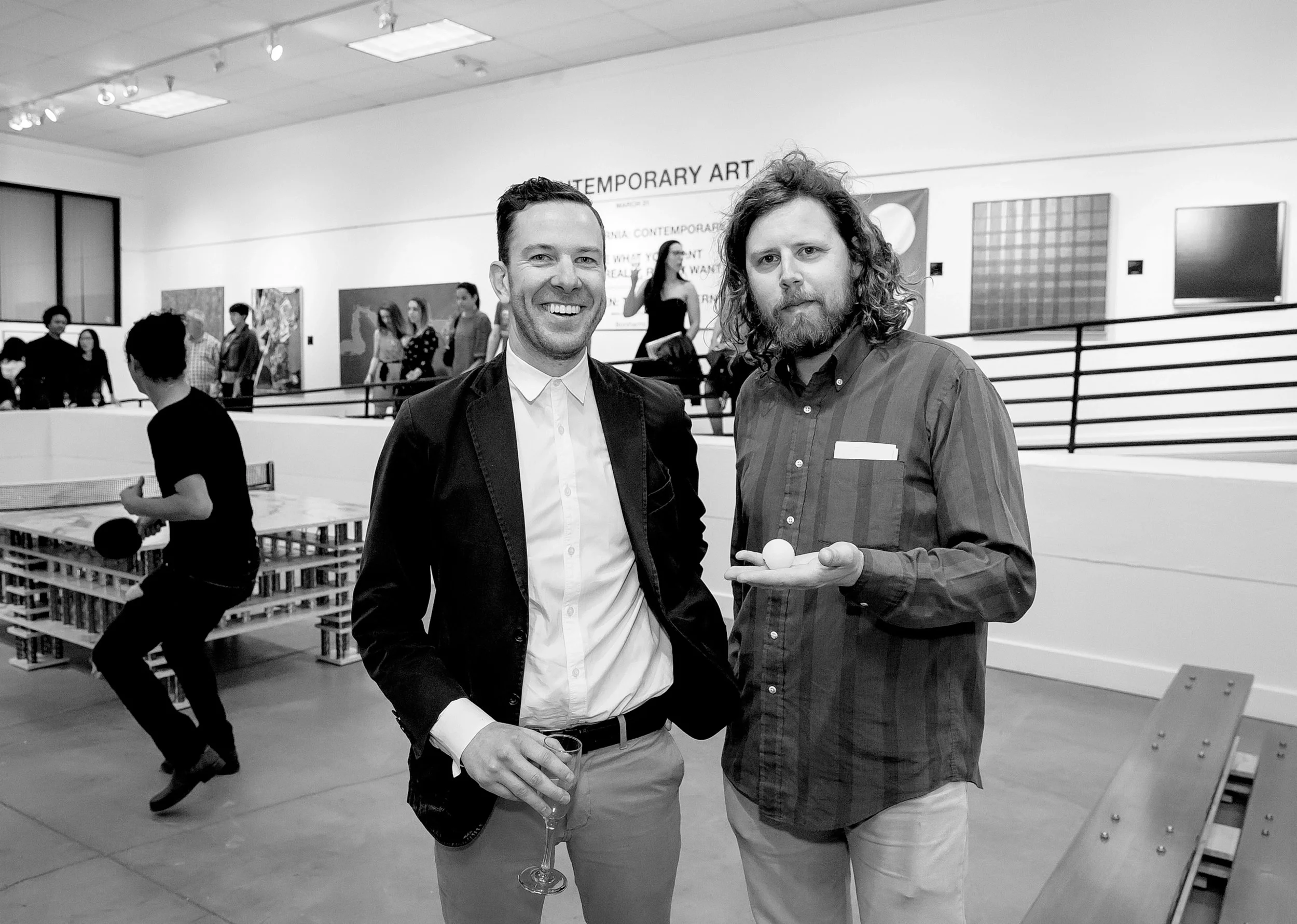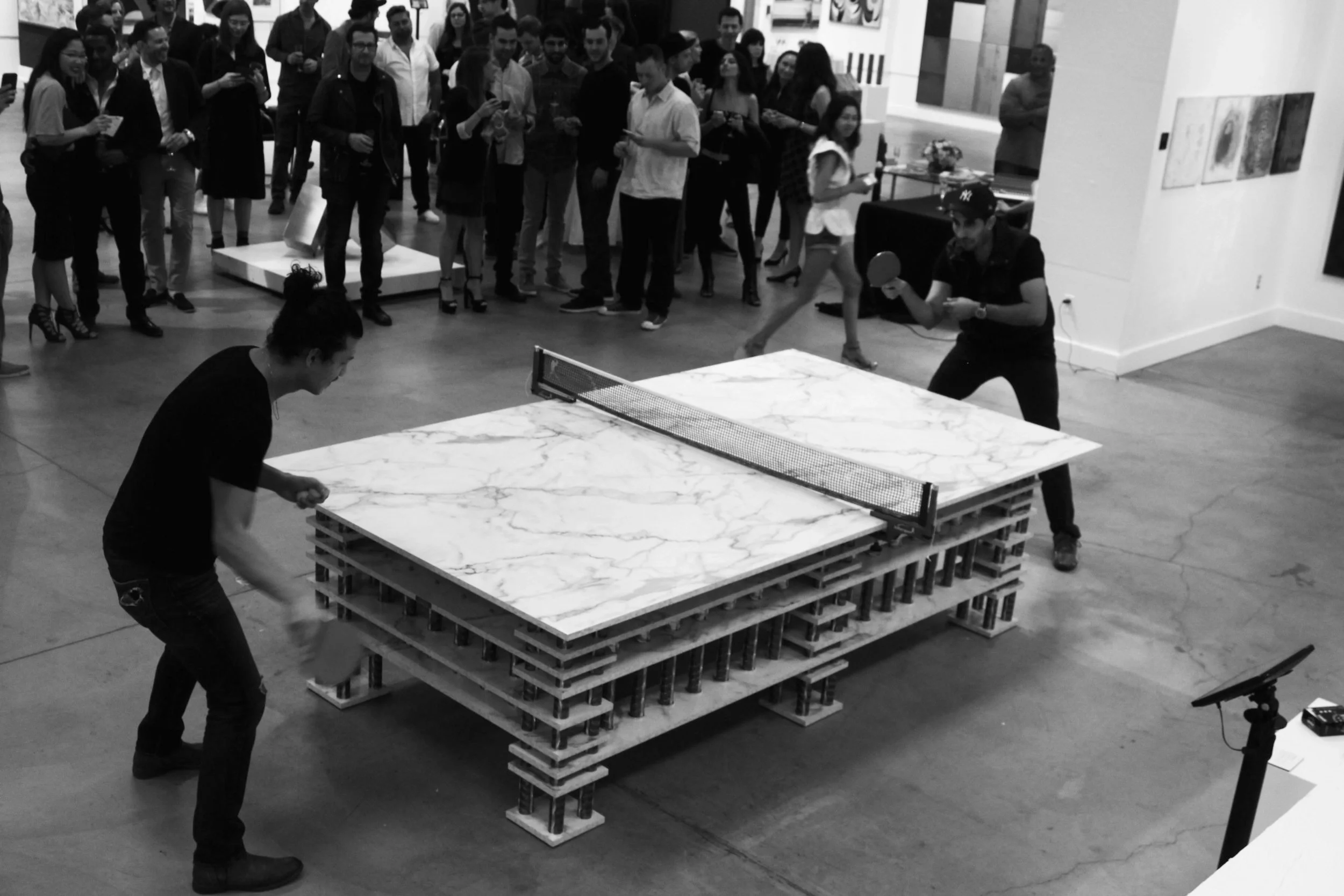 One of the centerpieces of Tell Me What You Want was the private sale offering of LA artist, Ry Rocklin’s Ping Pong Table from his Trophy Modern series where he makes sculptures of pragmatic objects from common modular trophy parts ordered from catalogs. This work became the proxy for the auction itself and I had the idea to print the titles on ping pong paddles which looked remarkably similar to auction paddles. I hired two professional ping pong players to come in and play an exhibition game on the table during the preview party sponsored by the LA cultural magazine, Flaunt.