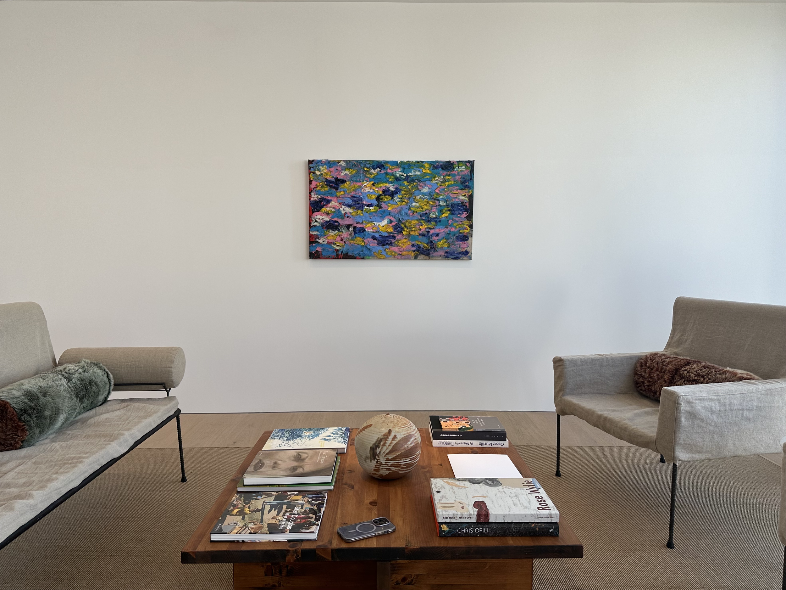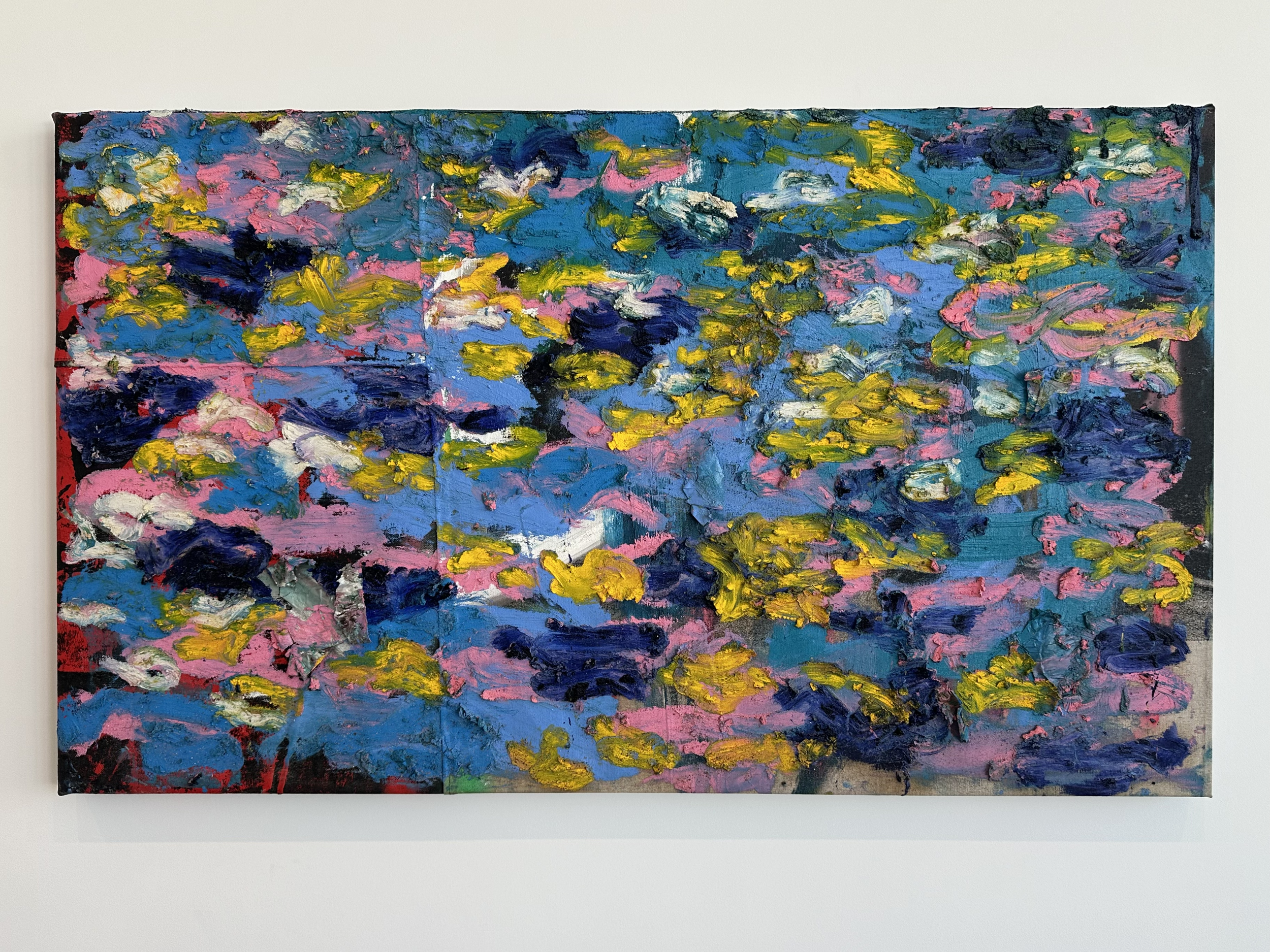 Sometimes I use a tool to test the barometer of a work of art by asking myself “could I write a thesis about this work?” With Oscar Murillo’s “surge” paintings one does not have to look too far to find a network of threads to pull on. This body of work does not operate in a linear way and is much more rhizomatic, referencing a myriad of topics from landscape painting, Claude Monet’s last years, social issues of today, the origins or Abstract Expressionism, and Murillo’s own body of work which all coalesce around the unifying idea of sight. The complexity of this series, is not only what saw Murillo win the Turner Prize, but also the subject of a new installation at the Tate this summer entitled “Flooded Garden.”