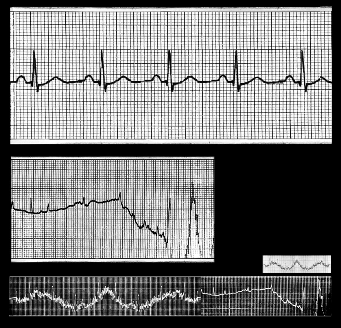 Sandra Llano-Mejia In Pulso (1978) devised a way of creating a “self-portrait” by manipulating her heartbeat to alter the linear pattern that an electrocardiogram produces. In her manipulation of the machine, the peaks and valleys of the line appear as though she has died and come back to life repeatedly.