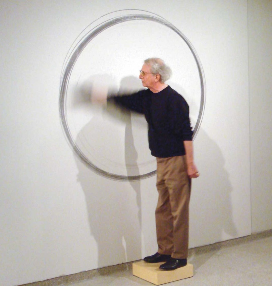 Tom Marioni’s Out-of-Body-Free-Hand-Circle, 2007-9, conceptual performance and “action drawing”, explores the limits of the body and is constructed of a continuous line that defines a previously undefined space. Each drawing is unique and is defined not only by the body in action but the amount of time dedicated to the performance, the drawing device used, the artist’s position and the force applied.