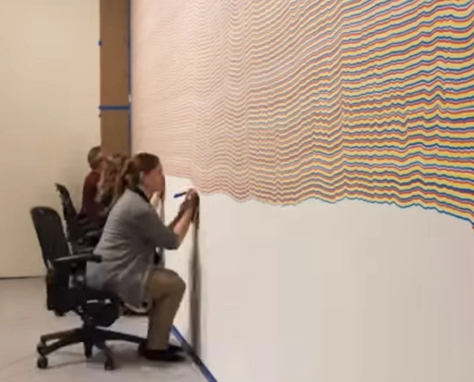 "The first drafter has a black marker and makes an irregular horizontal line near the top of the wall. Then the second drafter tries to copy it (without touching it) using a red marker. The third drafter does the same, using a yellow marker. The fourth drafter does the same using a blue marker. Then the second drafter followed by the third and fourth copies the last line drawn until the bottom of the wall is reached."