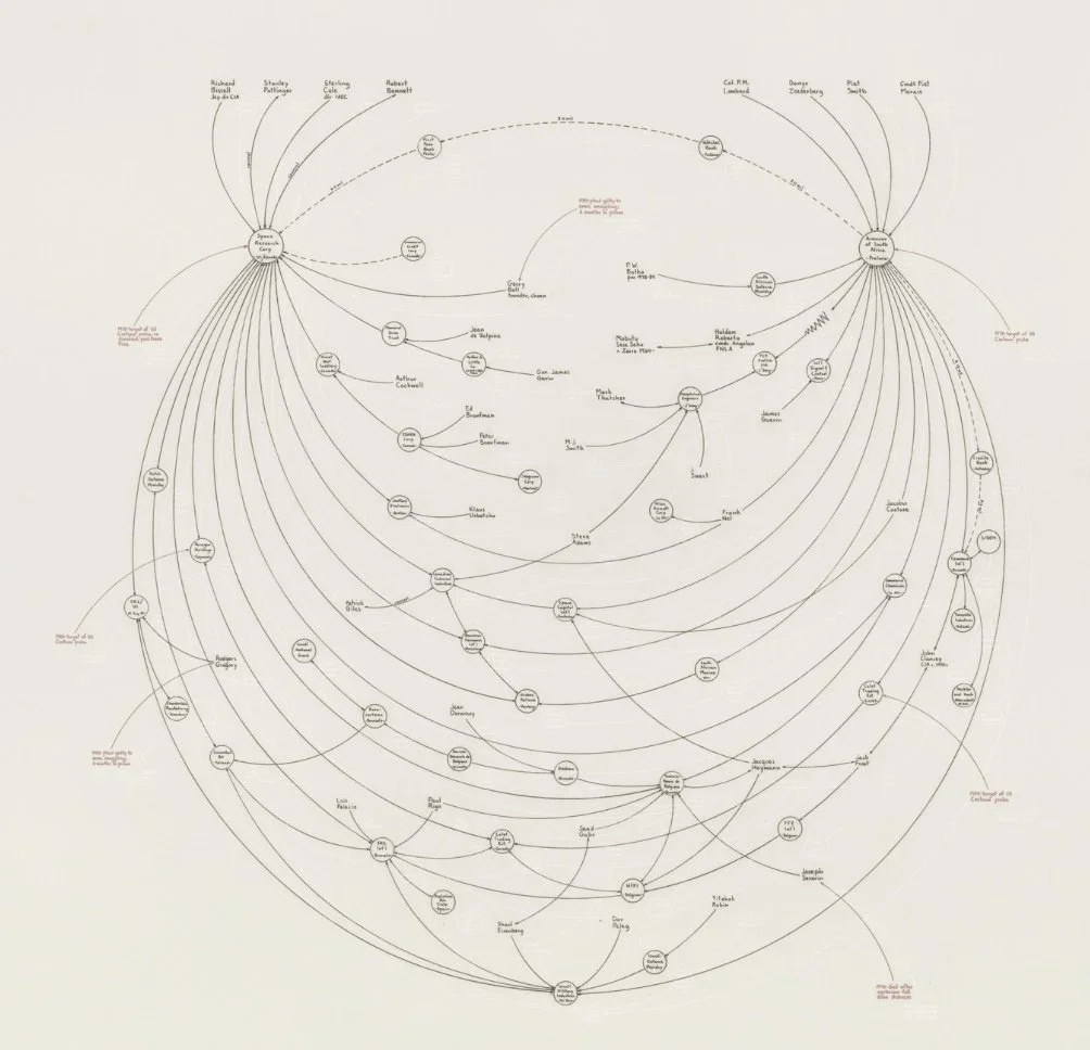 Mark Lombardi’s Gerry Bull, Space Research Corporation and Armscor of Pretoria, South Africa, c. 1972–80 (5th Version), 1999 is one of his signature diagrammatic drawings which posits connections between seemingly disparate but connected politicians, private individuals, institutions, governments, cartels and companies. This work maps the players in the “Supergun” affair in the dealing of arms to Iraq and involved the UK's Secret Intelligence Service, two members of the UK parliament, Saddam Hussein and Canadian engineer, Gerry Bull who was assassinated in 1990. Each notation on the flowchart contains a name which is then rhizomatically connected to one or several others. Lombardi’s heavy research-based works create real world links that illustrate essentially webs of deceit of many of the bad actors in the contemporary world, rationally mapping scandals like this one in stunning beautiful fashion. These were so accurate it is rumored the FBI asked to study one of his works at the Whitney.