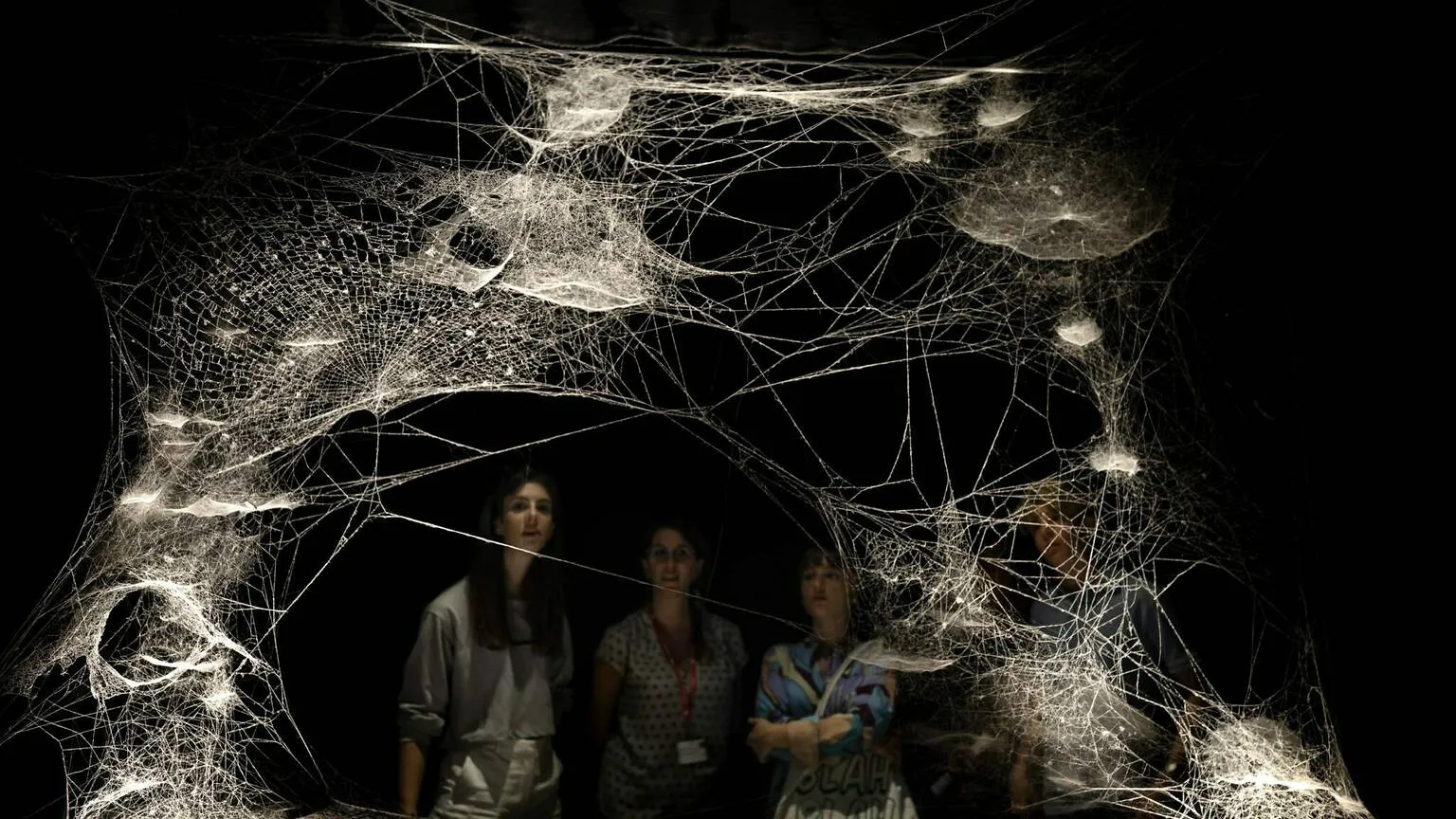 Tomas Saraceno’s Oracle Readings, Weaving Arachnomancy, Synanthropic Futures: At-ten(t)sion to invertebrate rights! (2019) installations shift the creation of artwork from humans to spiders to create unique linear architecture in space. He selects differing and unrelated species of spiders and sees how and what complex silk constellations they create together in the same space. Art times, they merge and in others they stay connected yet separate. It reflects on ideas of labor, collaboration, sociability, performance and chance.